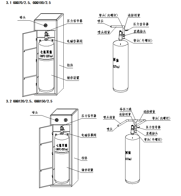 由容器阀、虹吸管、储存容器组成。储存容器为可重复充装的红色环氧漆钢质焊接容器 。 容器阀由阀体、电磁型驱动装置、活塞、压力显示部件、泄压装置等组成,接上虹吸管后安装在储存容器瓶口上,可气动、手动开启容器阀释放灭火剂。
